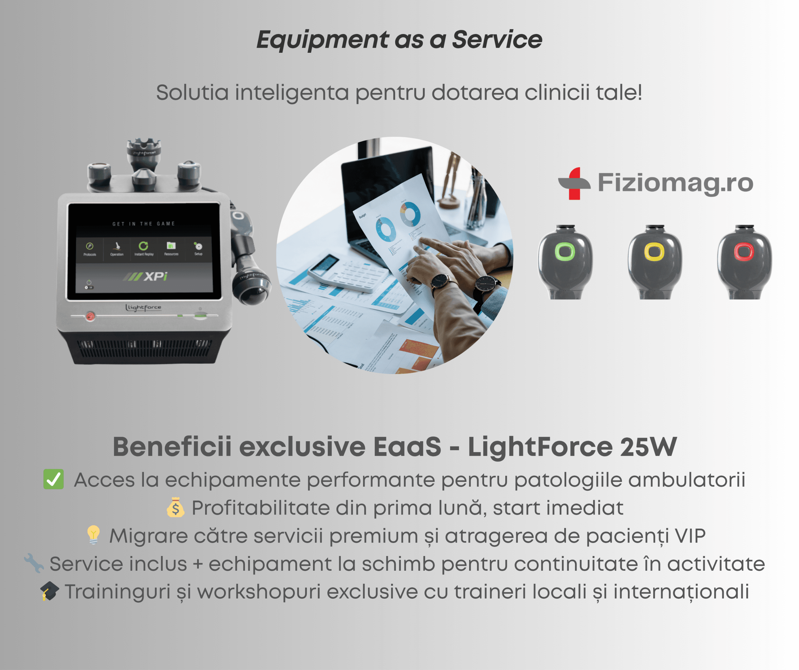 Închiriază laserul terapeutic de mare putere LightForce® XPi 25W prin modelul inovator EaaS (Equipment as a Service) și adu în clinica ta cel mai avansat partener clinic inteligent. Oferă pacienților tratamente personalizate, rapide și sigure, pentru o gamă completă de afecțiuni musculoscheletale și leziuni sportive, fără investiții inițiale semnificative. Ideal pentru clinici de fizioterapie, recuperare medicală și medicină sportivă.
